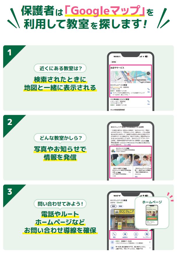 ・外部サイトやSNSなどでの名称・住所・電話番号の一貫した掲載(ネット上での教室情報の一致)