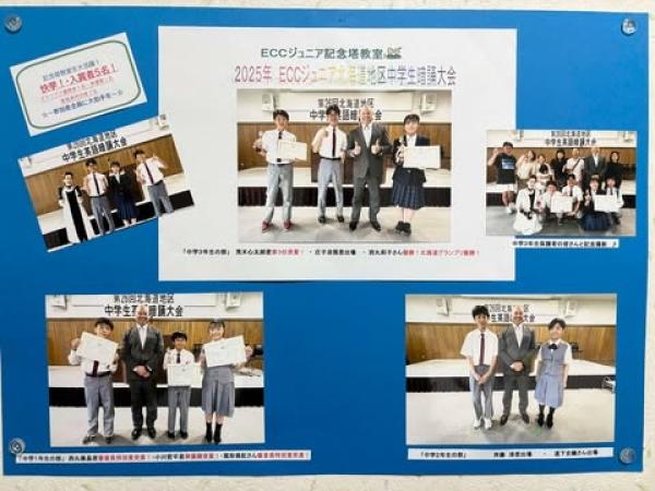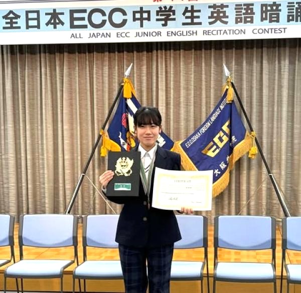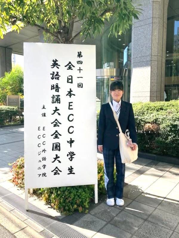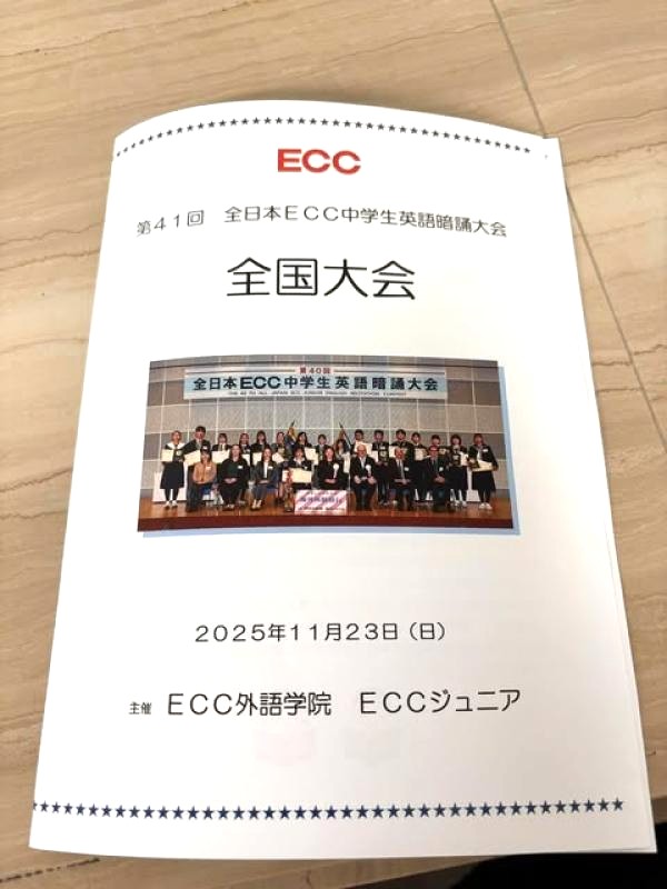 2025年11月23日(日)ECC大阪本部に於いて第41回 全日本ECC中学生英語暗誦大会全国大会が行われました。中1生16名、中2生16名、中3生18名が全国の1万以上あるECC外語学院、ECCジュニア教室から予選審査を見事突破!大会当日、当教室生中3生のR.Nさんは第3位「銅賞」を受賞致しました!夏の北海道大会ではグランプリも受賞され、今回の全国大会の大舞台でも流暢に堂々と発表されていました♪