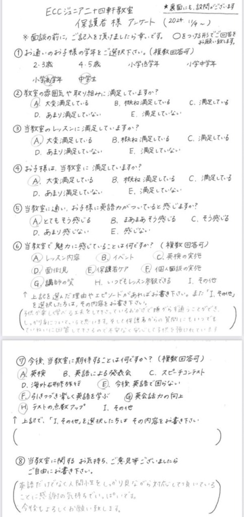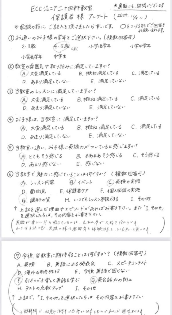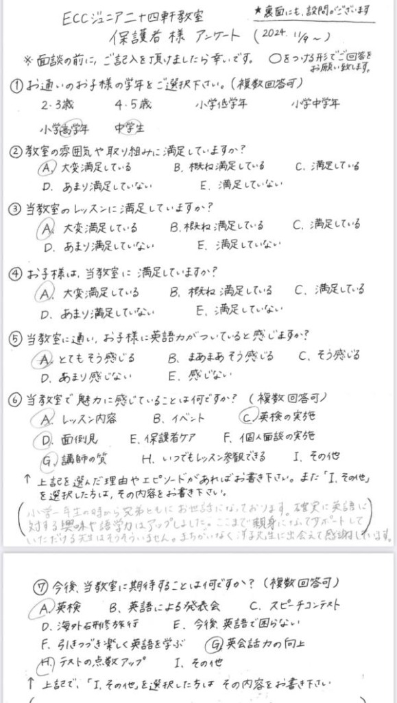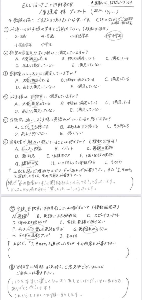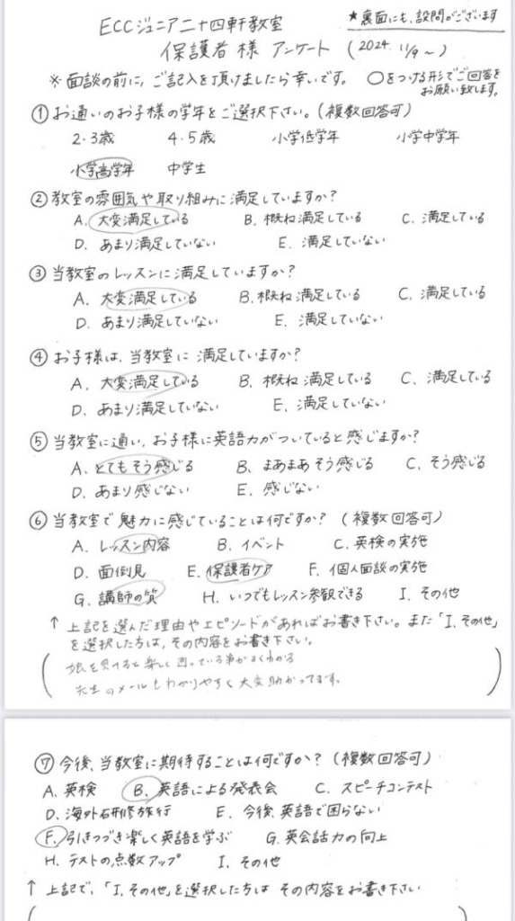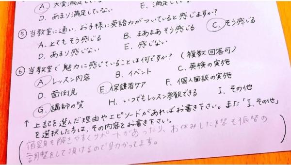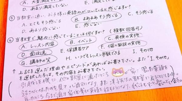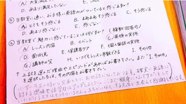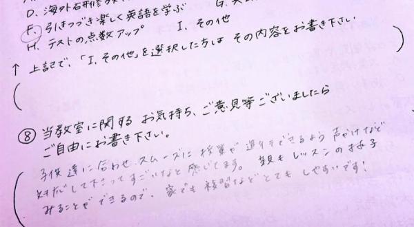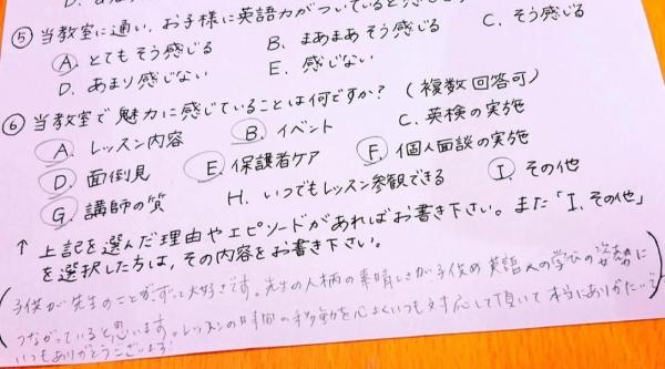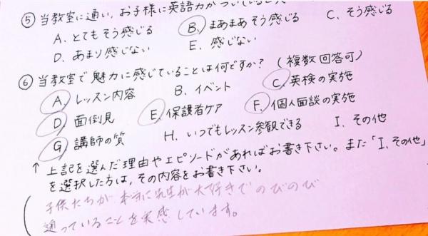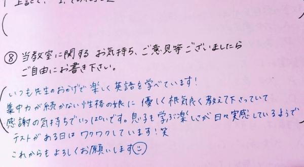 ◯英語を教えるだけでなく子どもの人間性をしっかり見ながら対応して頂いており、感謝しております。