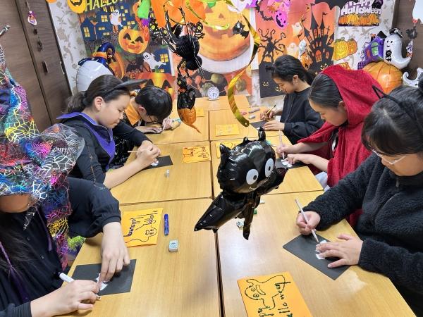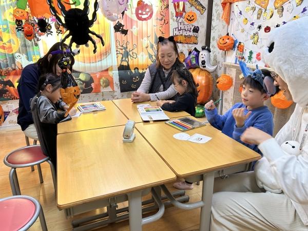 「先生、こんな感じですか」「そうそう」、来年のハロウィンパーティーは、何をしようかな?楽しみにしていてね。