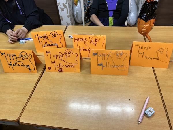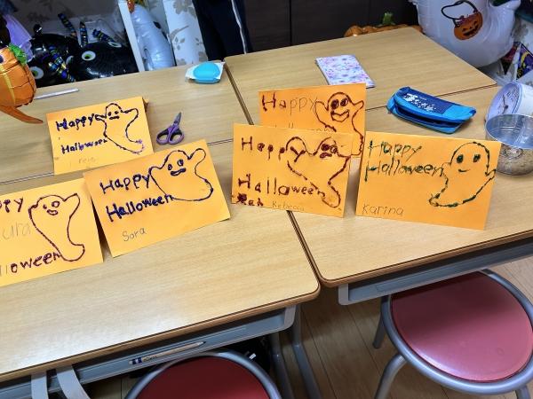 10月30日 ハロウィンパーティー、木曜日、小学1,2,3年生クラスだよ。何するんだろう、とにかくわくわく感満載です。カードも作ってお菓子ももらって帰りました。
