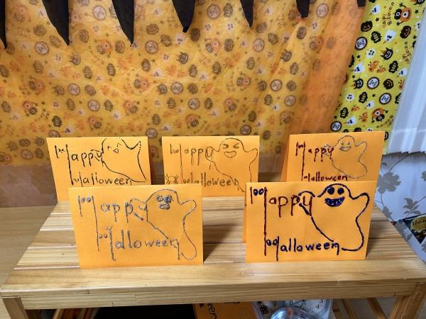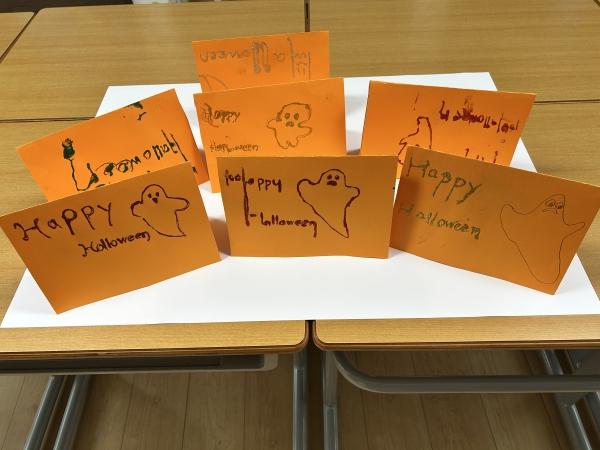 10月28日 ハロウィンパーティー、小学6年生クラスだよ!ハロウィンカード、上手く出来ました。お菓子もあって楽しかったね。
