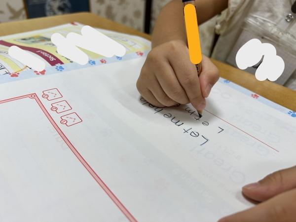 9月10日 年長さんの鉛筆の持ち方がきれいですね!お父様に”Let me help.”「手伝うよ」のメッセージカードを作りました。英語の字もきれいですね。