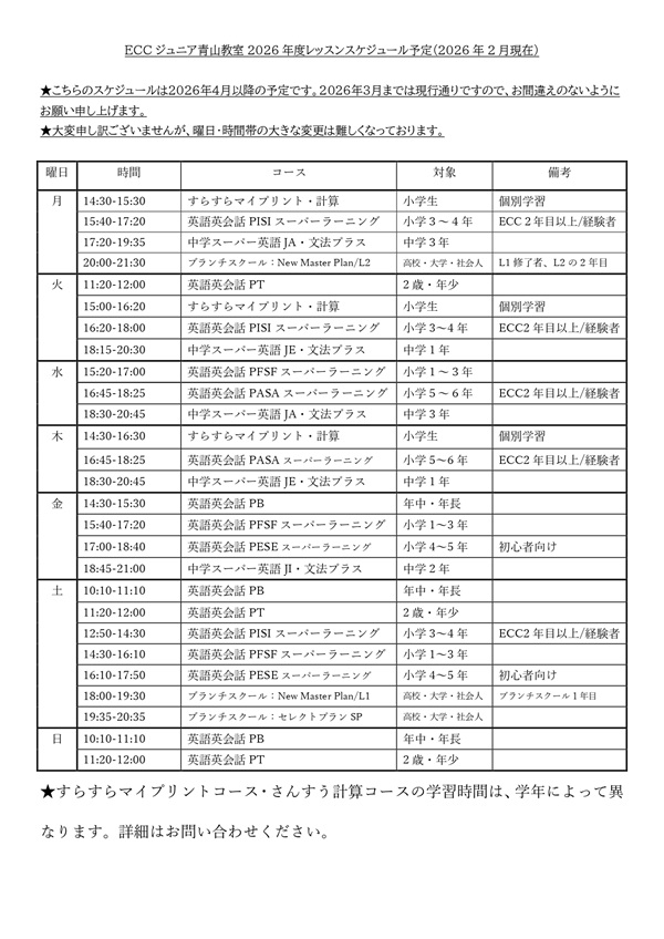 2026年4月からのレッスンスケジュール