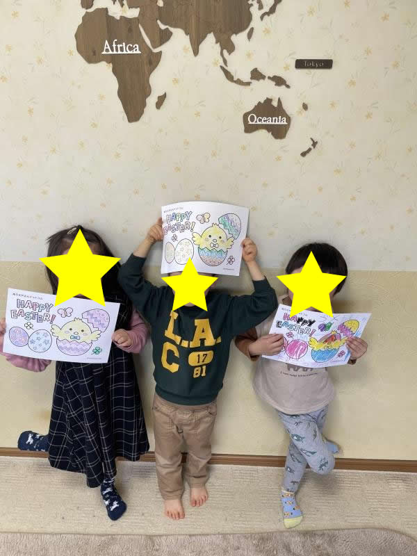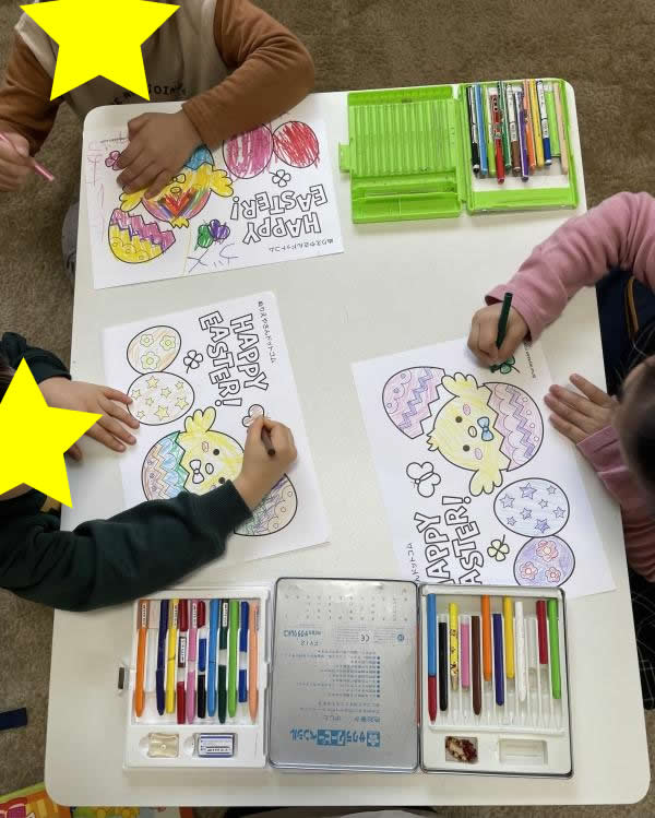 最後の日は、Easterのしかけ絵本を読んだり、塗り絵をしたり、アメリカでのイースターについてもお話しました。