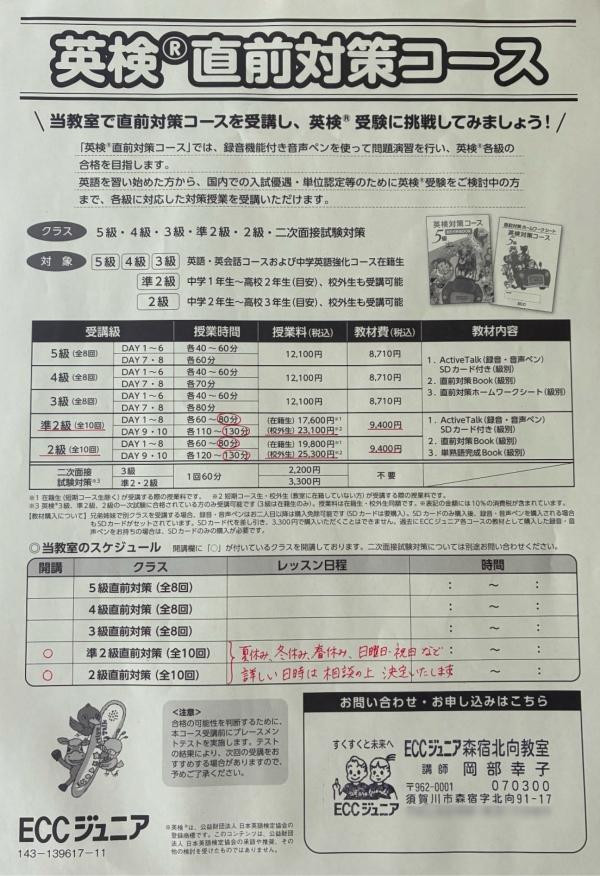 ECCジュニア森宿北向教室では、英検®︎直前対策コースを実施しており、2級、準2級プラス、準2級の対策が在籍生だけでなく校外生の方でも受講できます。