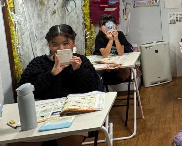 また、最後のお写真は、発音をするときの口の形を実際に見ながら練習をしているところです。
