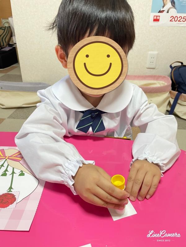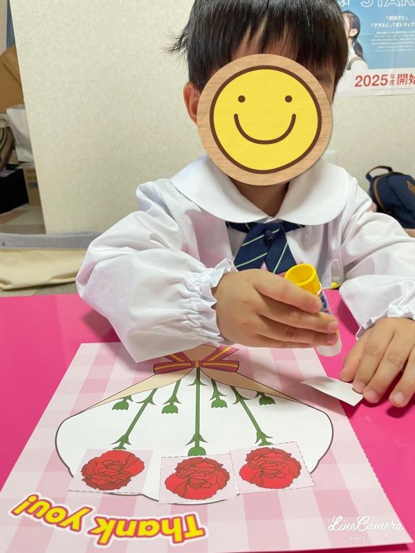 3歳児クラスではカーネーションのクラフト。T君は初めてノリを使って、工作をしましたよ。とっても上手に貼れていました。ママにあげようね〜。