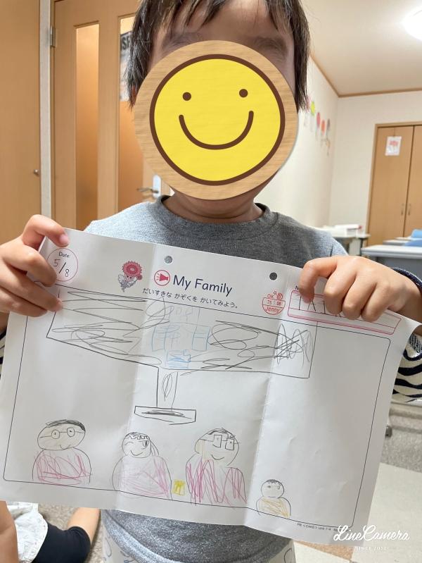 4,5歳児クラスは家族の紹介インタビューからスタート!宿題で描いてきてくれた絵について、説明してくれましたよ。