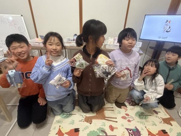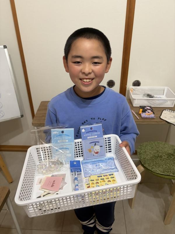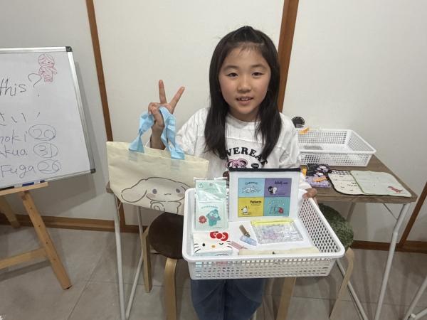 1年間単語テストで頑張って貯めたポイントを使って、文房具やハンカチなど英語でお買い物していただきます♪講師が子どもたちはどれが好きかな〜と悩みながら選んだたくさんのグッズから好きなものを選んでね♪1年間単語学習を頑張った子はそれだけポイントが貯められるので、ポイントを金額に換算して色々買うことができます♪