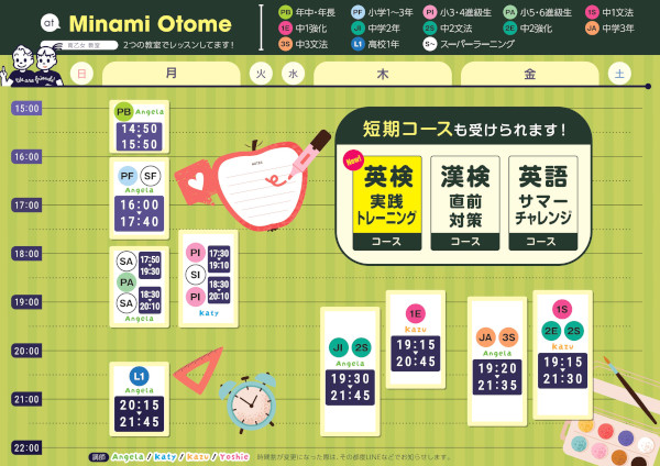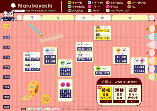最寄りのお教室の曜日や時間が合わない場合も、近隣のお教室の時間割を見てみてください。