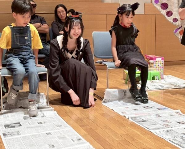 新聞紙レース 誰が1番早く足で新聞を手繰り寄せられるか!