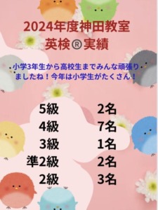 2017.11.14 英検®実績情報 当教室は実用英検®の準会場として認定をいただいています。 2016年度実績 5級合格 6名 4級合格 10名 3級合格 4名 準2級合格 9名 2級合格 2名 それぞれが自分の目標をたて、頑張っています。