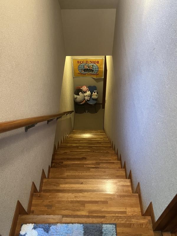 教室は地下にあります。階段の真正面はトイレです。