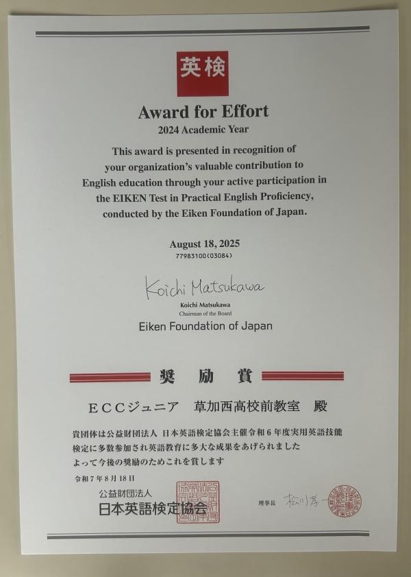 今年も年3回の英検®実施と多数の受験参加に対して感謝状と奨励賞をいただきました