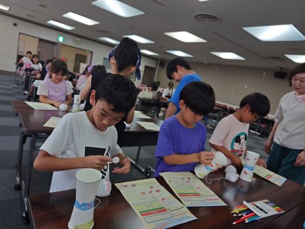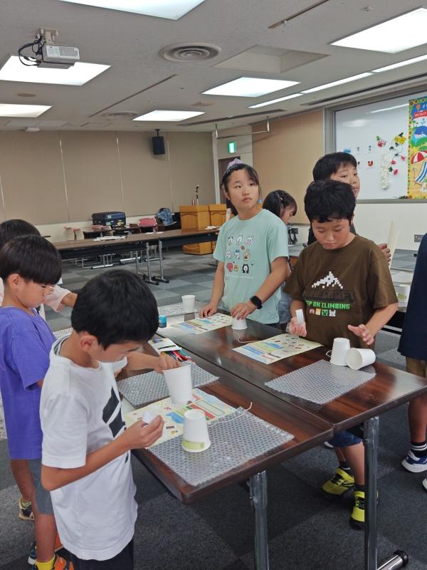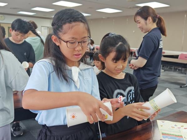 英語の説明を聞きながらけん玉作りに挑戦中