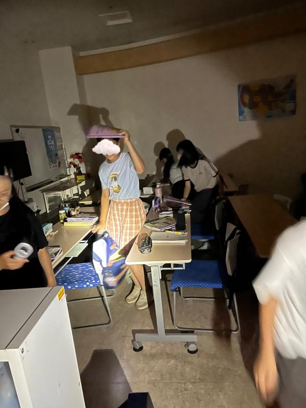 教室入り口は一つのみ。迅速に頭を守り、安全なロビー目指して教室脱出