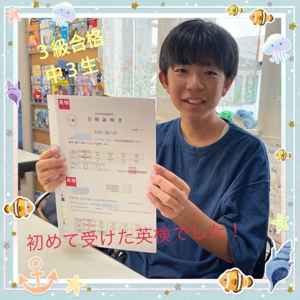 今年度から入学した中3のBobは、これまで英語が苦手で英検®も受けたことがなかったのですが、一念発起でECCに通い始め、英検®3級に一発合格!