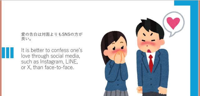 Round2: It is better to confess one’s love through social media, such as Instagram, LINE, or X, than face-to-face.