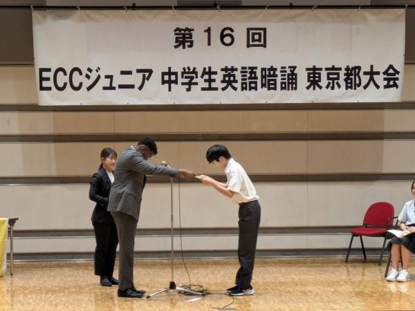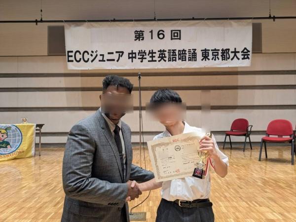 第41回全日本ECC中学生英語暗誦大会全国大会が2025年11月23日にECC本社ビル(大阪府)にて開催され、当教室の中3生K.T.君が厳しい予選を勝ち抜いて代表50名の一人に選ばれ、全国大会に出場しました!