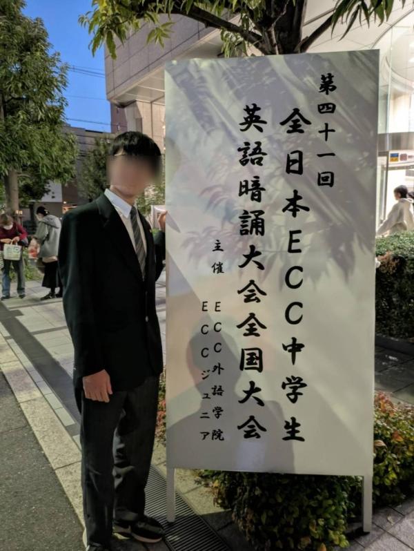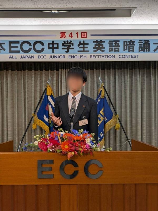 第41回全日本ECC中学生英語暗誦大会全国大会が2025年11月23日にECC本社ビル(大阪府)にて開催され、当教室の中3生K.T.君が厳しい予選を勝ち抜いて代表50名の一人に選ばれ、全国大会に出場しました!