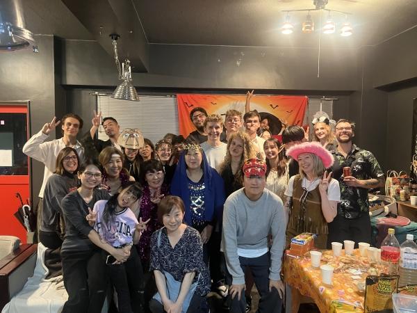 ジュニアパーティー終了後、打ち上げも兼ねて、コミュニティパーティーに地域在住の外国人もコスチュームも着て参加して、ピザやポトラックで国際交流となりました。