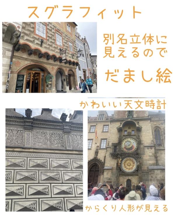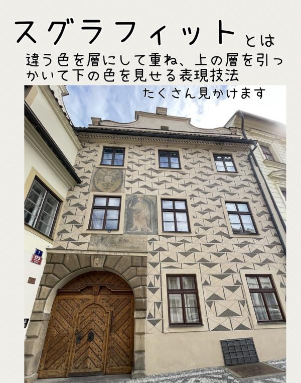 たくさんの建物がスグラフィットで、柄が立体に見えるのに近くに行くと平面。