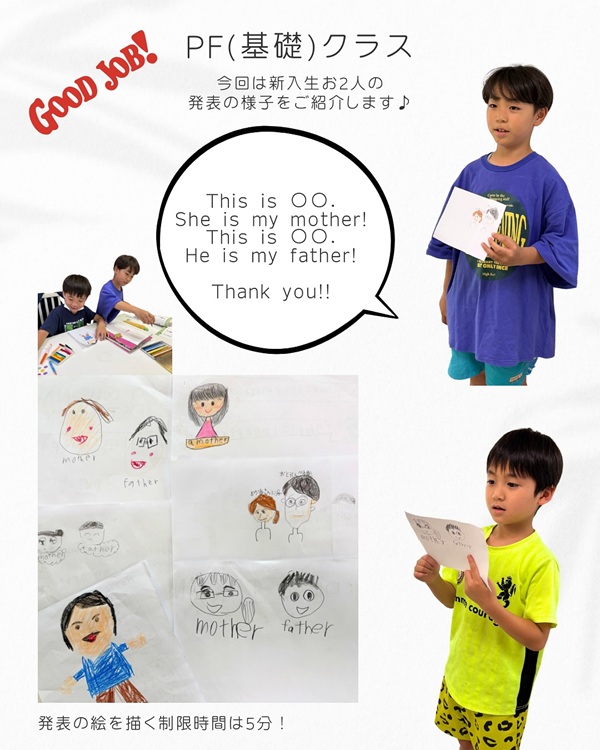 今週は「家族」についての発表練習をしました♪自分で描いた家族の絵を見せながら、英語で紹介しました。絵を描くは時間5分。