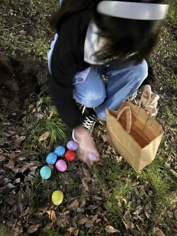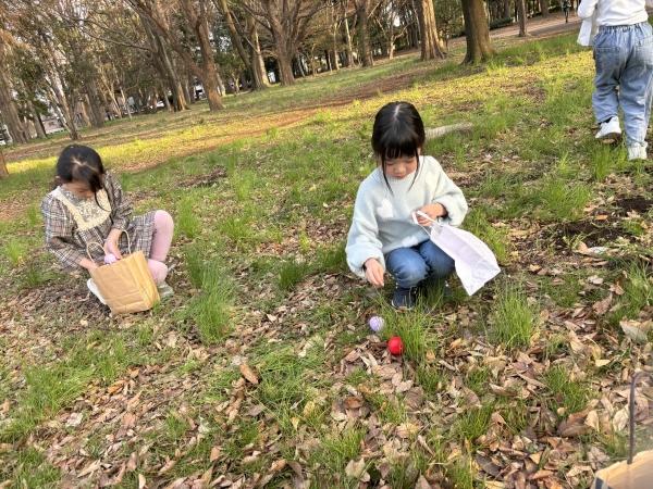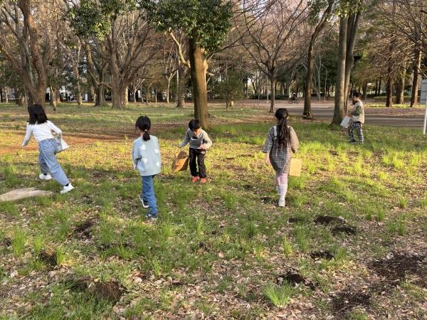 キャンディーの入ったプラスチックのエッグを用意し、教室のすぐ隣にある小金井公園の一角に隠します。