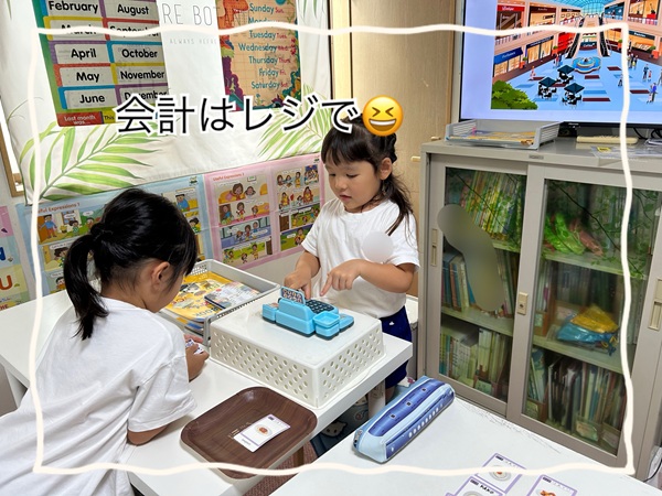 レジでのお会計がやりたくて、お店屋さんはみんなで交代で。