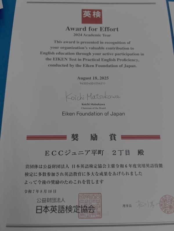 英検®協会より、感謝状と奨励賞を二つもいただきました!