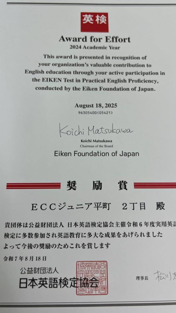 英検®協会より、奨励賞いただきました!