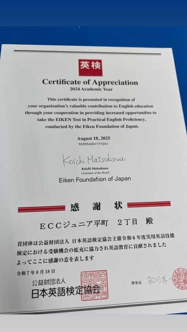 英検®協会より、 感謝状いただきました!