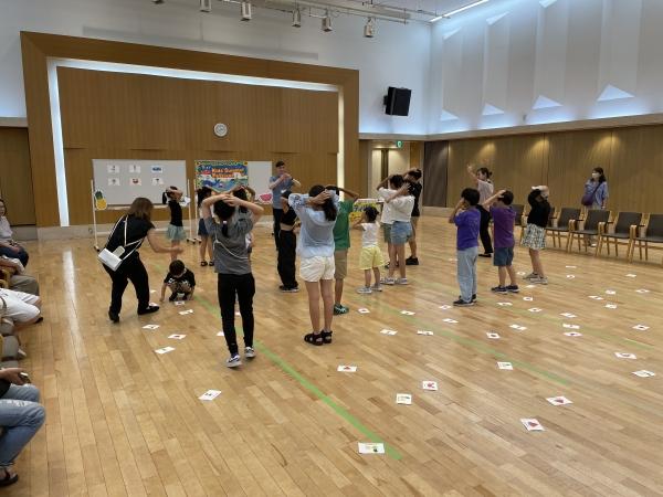 前半はみんないっしょにゲームを楽しみました。子供達も積極的に先生に話しかけます。