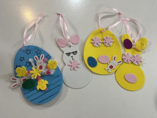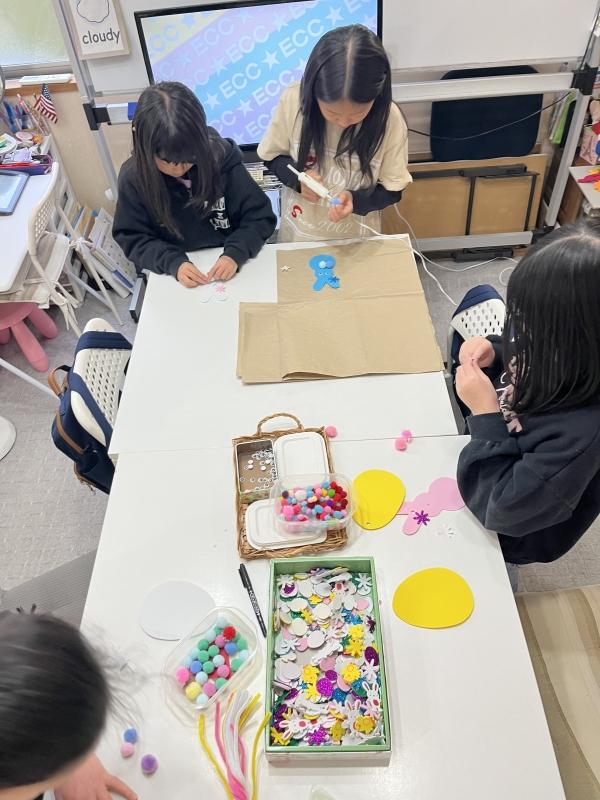 各クラスでクラフトキットを使って、それそれエッグとラビットにデコレーションして、教室の壁に作った草むらの中にしばらく飾らせてもらいました!