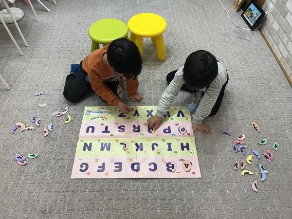幼児さんのクラスでも、ちゃんとアルファベットの形を覚えてて、右と左が半分になってても、力を合わせてアルファベットシートを作り上げました‼︎