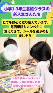 小学1,2年生PF/SFクラス。今までに習った単語を使いつつ、さまざまなトピックについて自分について発表します。