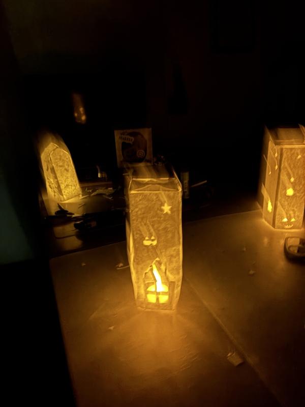 5.6年中1生クラスではハロウィンランタン作りをしました。牛乳パックで作ったランタンに、部屋を真っ暗にして灯を灯すととても幻想的でした。