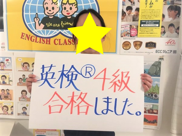 昨年の4月から当教室で英語学習を始めた小立野小学校4年生CNさん。昨年の秋に英検®5級に合格、そして今回英検®4級に合格しました。英語学習を楽しんでくれています。素晴らしい☆彡