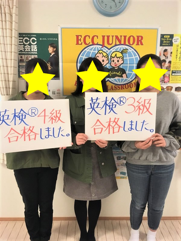 城南中学校1年生の仲良し3人組です。中学入学と同時に当教室に通い始めたYさんは英検®4級、小3から通っているKさんと小4から通うKさんは英検®3級に合格です。