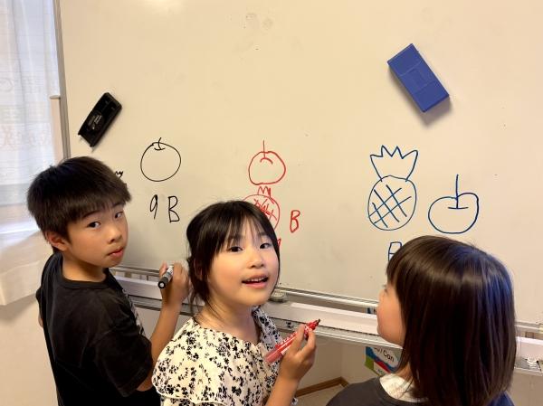 1・2年生のクラスです。英語の指示に従って文字や絵を描いています。