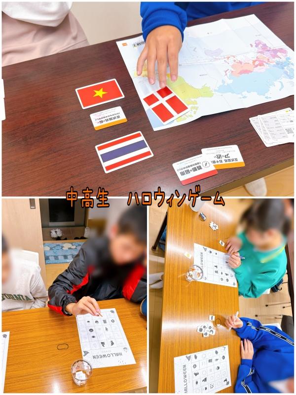 通常レッスンをショートバージョンで行い、ハロウィンビンゴ、用意しておいたボードゲームからしたいのを選び各クラスいろんなゲームをして楽しみました。