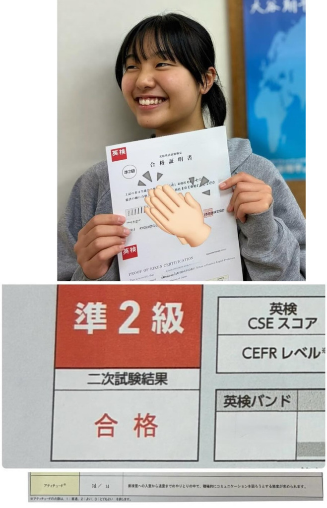 英検®︎準2級(高一修了目安)合格おめでとう!面接官に促される前に自分から積極的に答えたそうで、アティチュード(積極的な態度の評価点)も満点でした!
