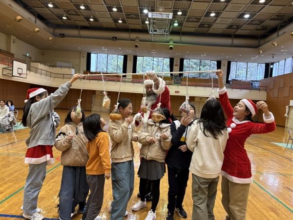 いわゆる「借り物競争」です。お家の方にサンタコスチュームのアイテムをあらかじめお渡しし、それらを探して早くサンタクロースを作ったチームが勝ち…というゲームです。これはさすがに小6のチームが早かったですね。ダントツでした。それにしても、出来上がったサンタさんは、みんなとても可愛かったです。