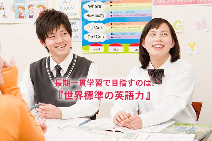 「世界標準の英語力」習得のために、ECCジュニアでは長期一貫学習プログラムを確立しています。幼児・小学生で学習を始めたお子さまが、中学生の段階で英語の基礎を完成させ、高校卒業の段階で高度な英語運用能力を身につけていただける英語教育を実践しています。