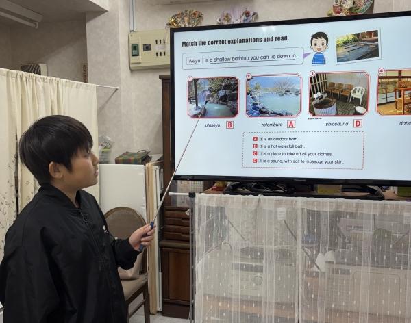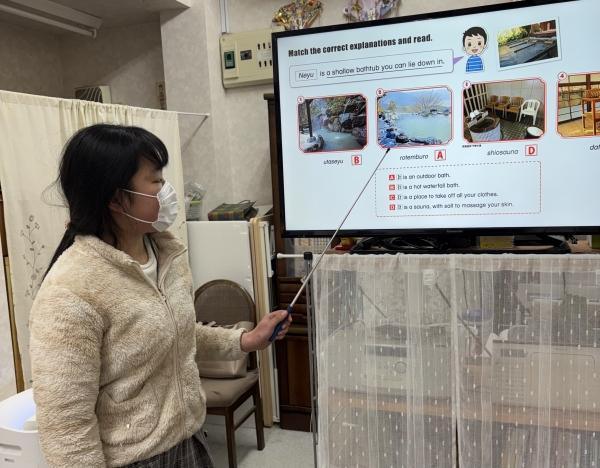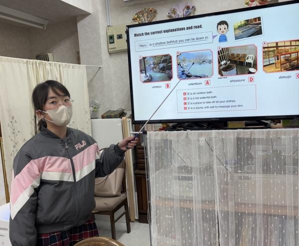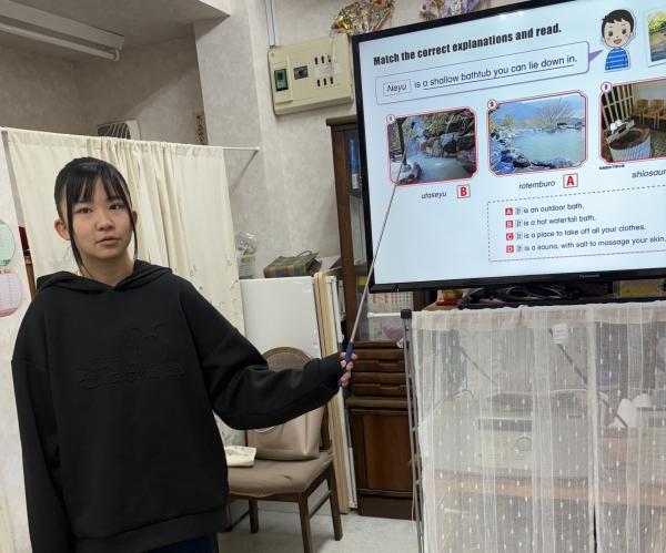 脱衣場、露天風呂、打たせ湯、塩サウナを英語で発表しました!!