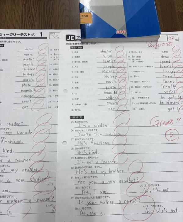 レッスン冒頭のウィークリーテストで単語や基本文の定着を目指します!