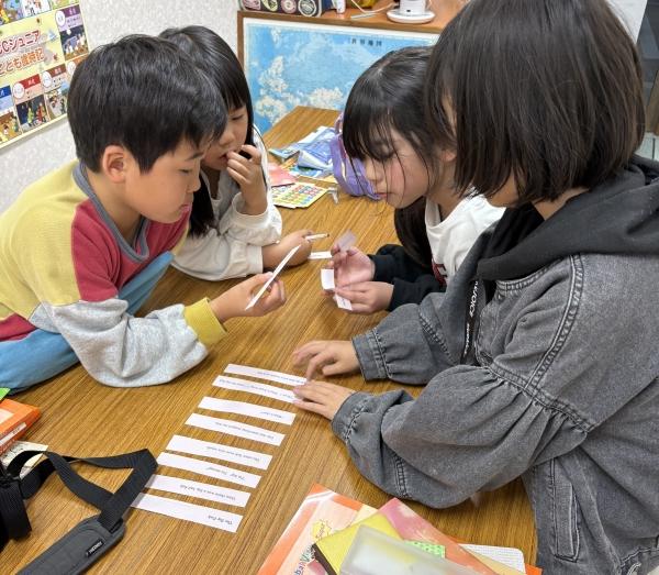 本の内容を一文ずつ書いたバラバラのカードを、ストーリー通りみんなで正しい順番に並べたよ!