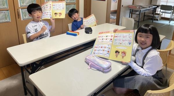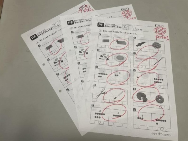 単語を覚えたか確認するボキャスロンは全員合格!ごほうびシールをもらって笑顔でパチリ。みんなとっても頑張っています。
