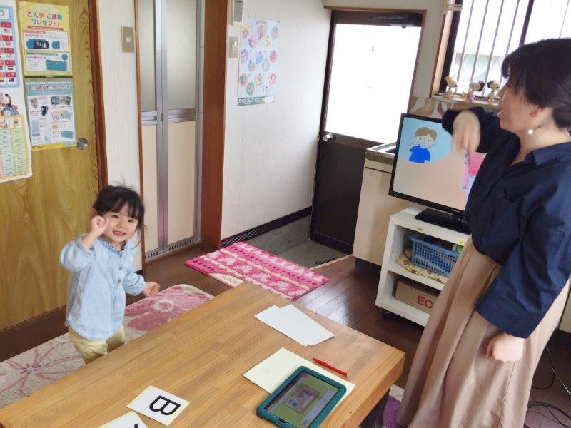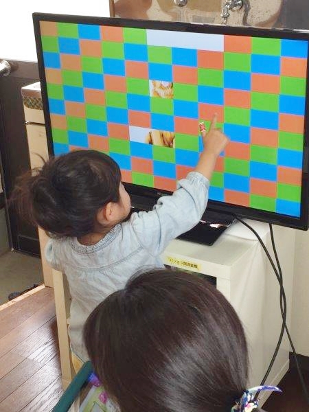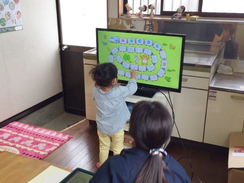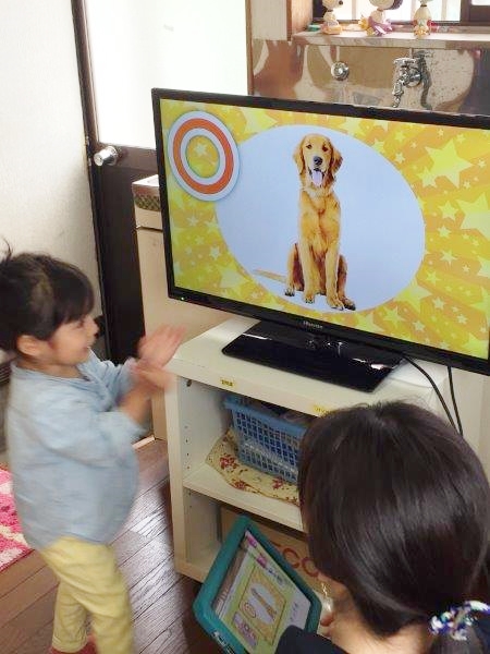 2歳児さんのクラス。映像と一緒に楽しく歌をうたいます。